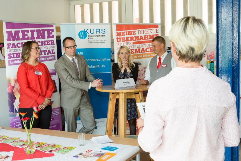 Wie man Warenkunde vermitteln kann, macht dann ein Quiz deutlich. Für die anwesenden Schülerinnen und Schüler wird es spannend. Auch Carolin Philipp, Referentin des Geschäftsbereiches Aus- und Weiterbildung der Industrie- und Handelskammer zu Köln, und Arik Werle, Abteilungsleiter der Ausbildungsberatung der Handwerkskammer zu Köln, raten mit.